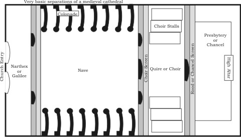 | The Nave today is usually the largest part of the church, the place where the general congregation assembles for worship. In the middle ages, however, it was not necessarily largest and could be quite small. Additionally, the medieval nave did not include benches or chairs for seating, those came later. Early congregations stood, or, like Shakespeare's groundlings, they simply sat down on the floor. The only seating provided were stone benches built into the church walls and there the elderly, sick, or disabled could rest. | ||
