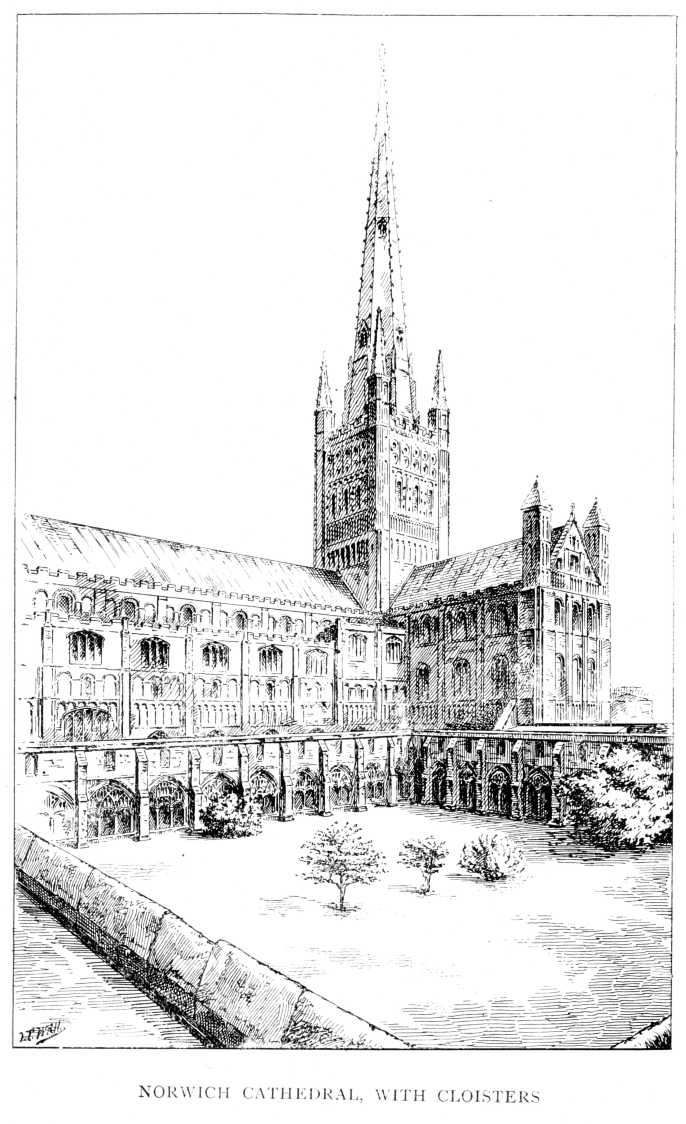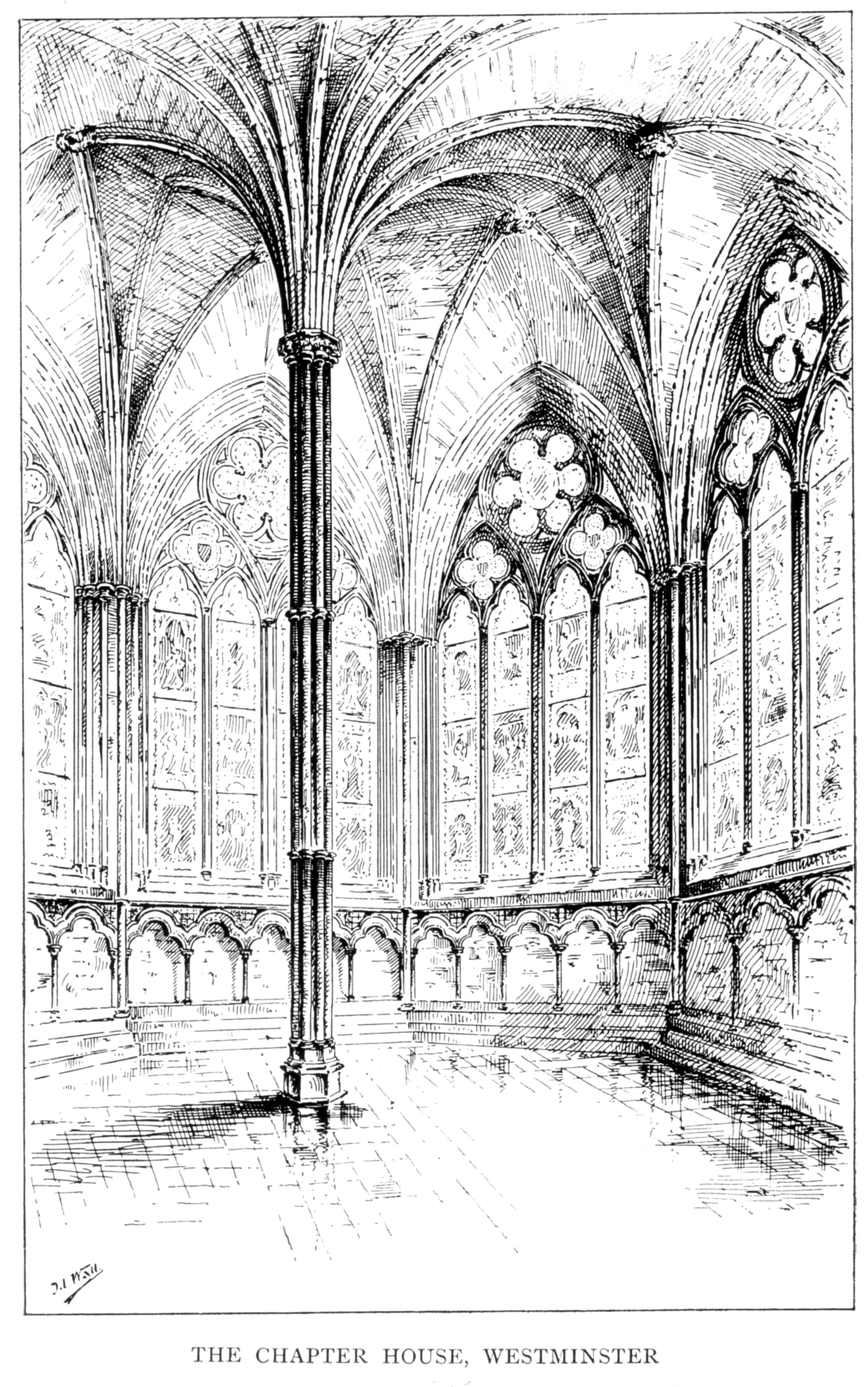 Illustration:  The Cloisters,  The abbot’s place, “since his dignity demands,” as the Westminster Custumal puts it, was somewhat apart from the rest. He had his fixed seat at the end of the eastern cloister nearest to the church door. In the same cloister, but more towards the other, or southern end, the novice-master taught his novices, and the walk immediately --18-- opposite,