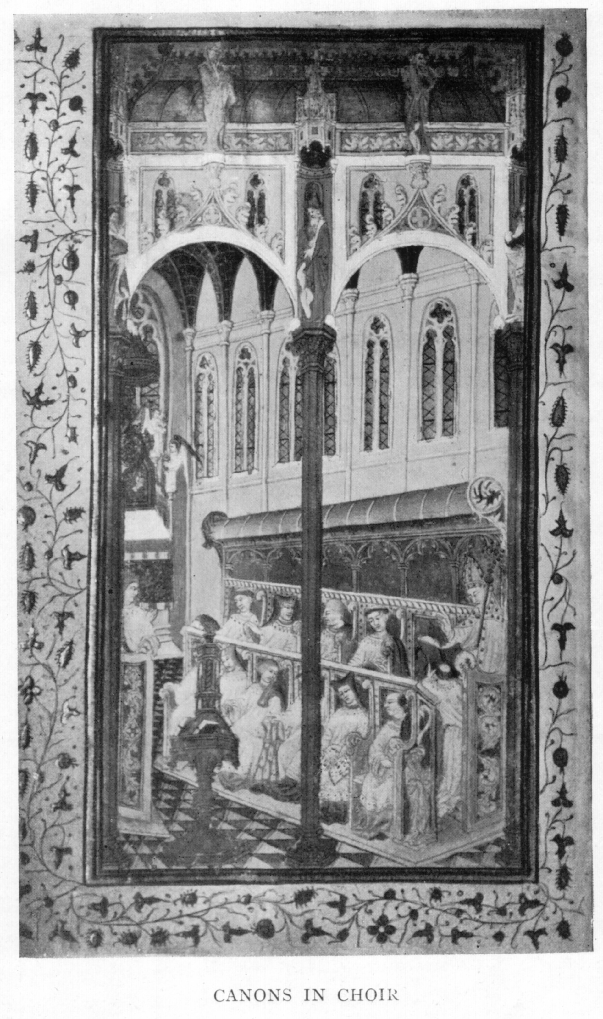 Illustration:   --page not numbered-- Insert: groundplan of Beaulieu --page not numbered-- “assisted at their divine service.” “Therefore,” says the great master of the regular observance, “let us consider in what manner and with what reverence it behoveth us to be in the sight of God and the Angels, and so let us sing in choir, that mind and voice may accord together.” So far as the religious life was concerned, the most important part of the church was of course the presbytery with the High Altar and the choir. Here all, or nearly all, public services were performed. The choir frequently, if not generally, stretched beyond the transepts and took up one, if not two, bays of the nave ; being enclosed and divided off from that more public part by the great screen. Other gates of ironwork, across the aisle above the presbytery and in a line with the choir screen, kept the public from the south transept. Privacy was thus secured for the monks, whilst by this arrangement the people had full access to all parts of the sacred building except the choir and the transept nearest to the monastery. The choir was entered, when the buildings were in normal English position, from a door in the southern wall of the church at the juncture of the northern and eastern walks of the cloister. At the western end of the same northern cloister there was generally another door into the church reserved for the more solemn processions. The first, however, was the ordinary entrance used by the monks, and passing through it they found themselves in the area reserved for them within the screens which stretched across the choir and aisle. In the centre of the choir stood the great raised lectern or reading-desk, from which the lessons were chanted, and from which, also, the singing was directed by the cantor and his assistant. The stalls were arranged in two or --15-- more rows
