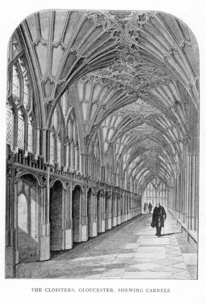 forepart, which had carved work to give light in at their carrel doors.  And in every carrel was a desk to lie their