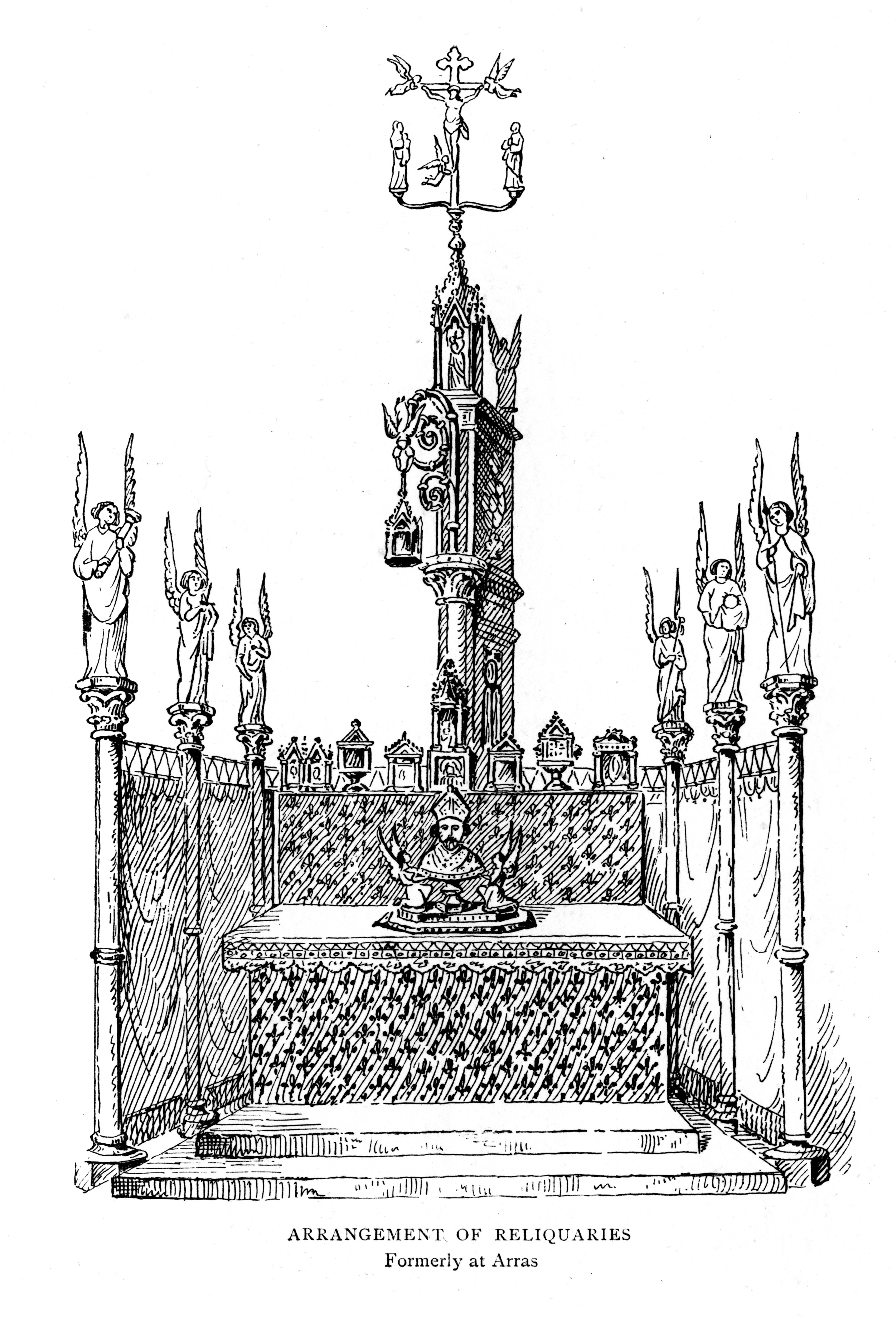 Reliquaries.] --23-- In that cathedral, showing the arrangement of reliquaries for a festival, where they form the retinue of the Divine Martyr of Calvary, flanking a pendent pyx containing the Host. In this a head shrine occupies the prominent position. One shrine attracted others to its vicinity : thus at Canterbury Cathedral the “corona” of St. Thomas the Martyr also received the shrines of St. Odo and St. Wilfrid, the one on the north and the other on the south. To receive sepulchre [to have your remains placed] near the tomb of a saint was considered on of the greatest honors that it was possible to bestow. It was thought to be helpful to the future life, and King John secured a potion between two shrines which, sadly enough, he evidently anticipated would make an unrivalled presentation at the heavenly court. The beam over the altar frequently bore one or more reliquaries, and at Canterbury a beam in another position served the same purpose, for we find in a book of obits of Christchurch Cathedral, from 1414-72, the following entry :— “In the year 1448, on the ninth of the calends of April, four brethren of this church took from the high altar the shrine with the bones of St. Fleogild (Feologeld), archbishop of Canterbury, and carried it after the Lord’s body to the shrine of St. Thomas and placed the shrine upon the beam spanning the arch leading into the chapel called the ‘corona,’ between the shrine of St. Thomas and the crown of St. Thomas.” Another