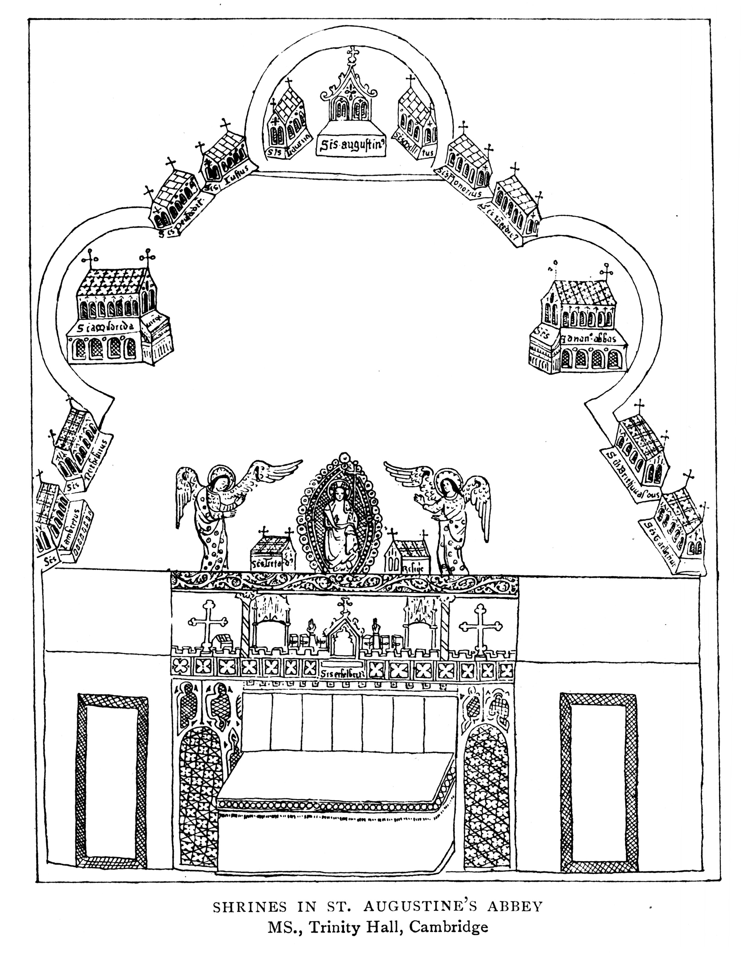 appears to have found favor with the churchmen of [Illustration: Glass Shrine] Very few shrines remain which contain or contained the relics of English saints, although this country was formerly unsurpassed such riches. William of Malmesbury was convinced that “nowhere could be found the bodies of so many saints entire after death”— typifying, as he thought, the state of final incorruption—as in England. “I myself know of five, but people tell of more. The five are Sts. Ethedreda and Werburga the virgins, King Edmund, Archbishop of Elphege, and the old father Cuthbert. All these, --25-- perfect in skin and flesh, from their flexible joints and lively warmth, appear to be merely asleep. To the above I can add the body of St. Ivo, St. Edward the King and Confessor, St. Wulstan the Bishop, St. Guthlac the Hermit, and those English Saints who died in foreign lands, namely, St. Edilburg the Virgin ; St. Lullus, Archbishop of Mentz ; and St. Edmund, Archbishop of Canterbury.”3 Now we can only