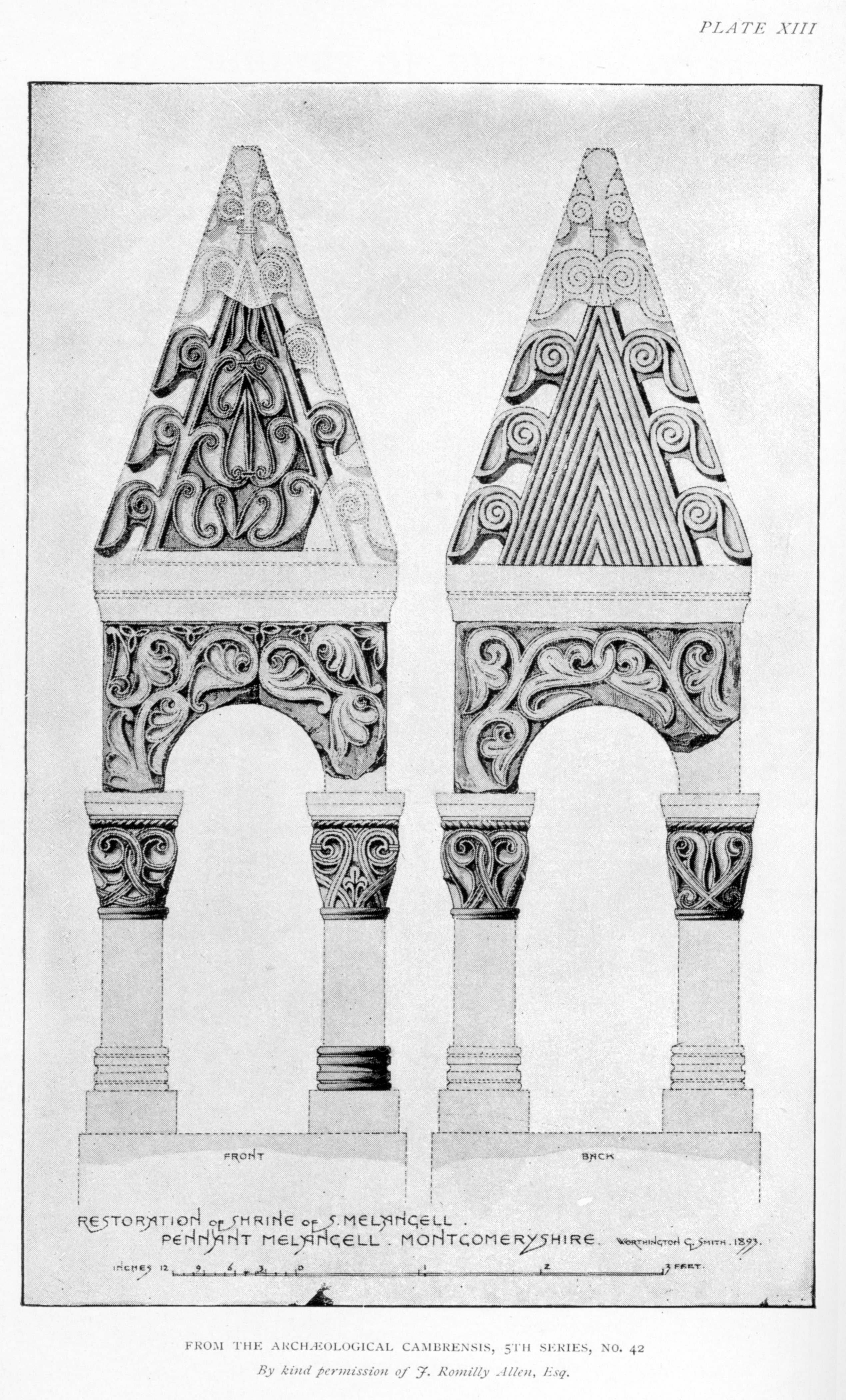 Melangell have recently been discovered at Pennant Melangell, A the east end of the church is a small rectangular chapel still called “Cell-y-Bedd,” the Cell of the Grave, in which the shrine formerly stood.